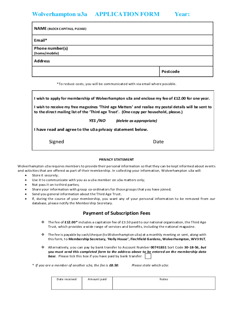 Wolverhampton u3aAPPLICATION Former:NAME (BLOCK CAPITALS, PLEASE) Email* Phone number(s) (home/mobile)Address Postcode *To reduce costs, you will be communicated with via email where possible. I wish