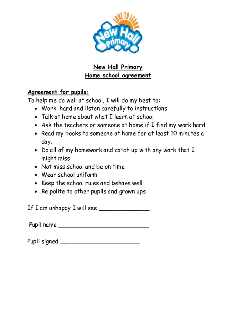 New Hall Primary Home school agreement for pupils: To help me do well at school, I will do my best to: Work hard and listen carefully to instructions Talk at home about what I learn at school Ask