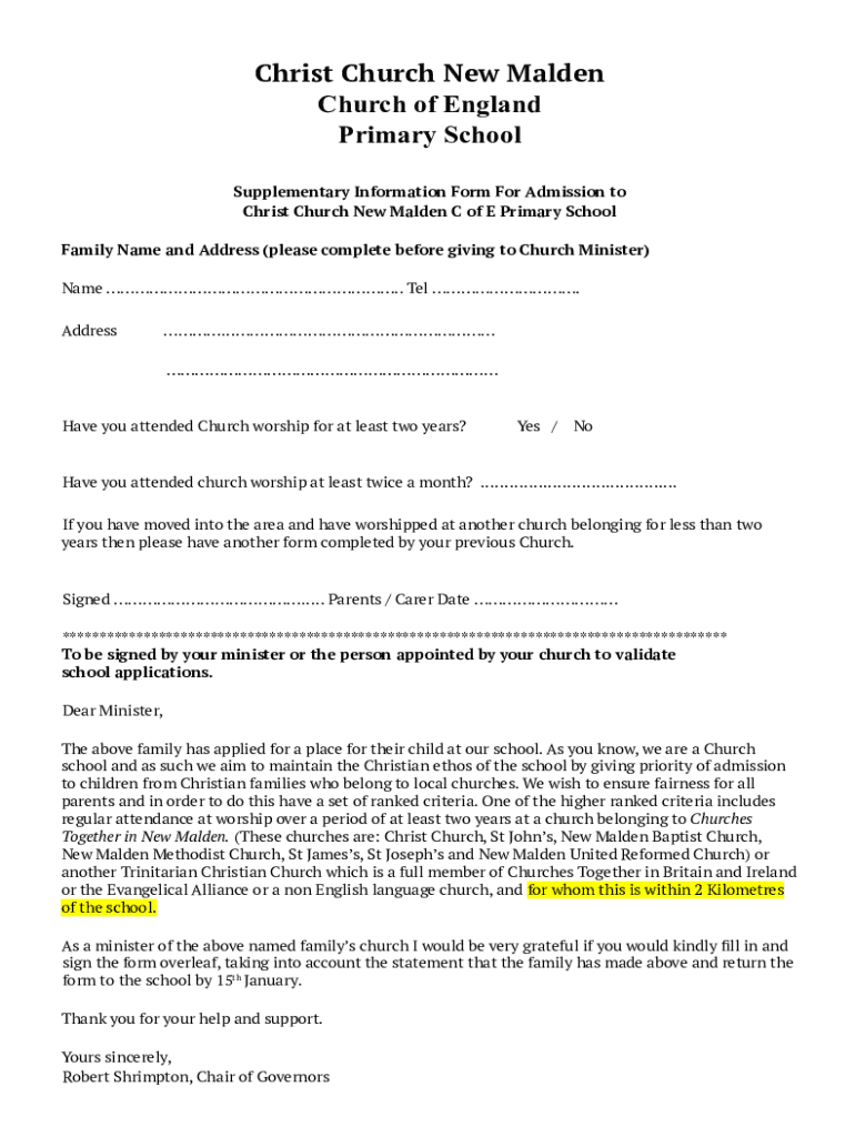 Christ Church New Malden Church of England Primary School Supplementary Information Form For Admission to Christ Church New Malden C of E Primary School Family Name and Address (please complete before