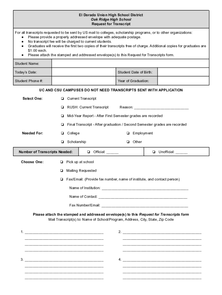 El Dorado Union High School District Oak Ridge High School Request for Transcript For all transcripts requested to be sent by US mail to colleges, scholarship programs, or to other organizations:
