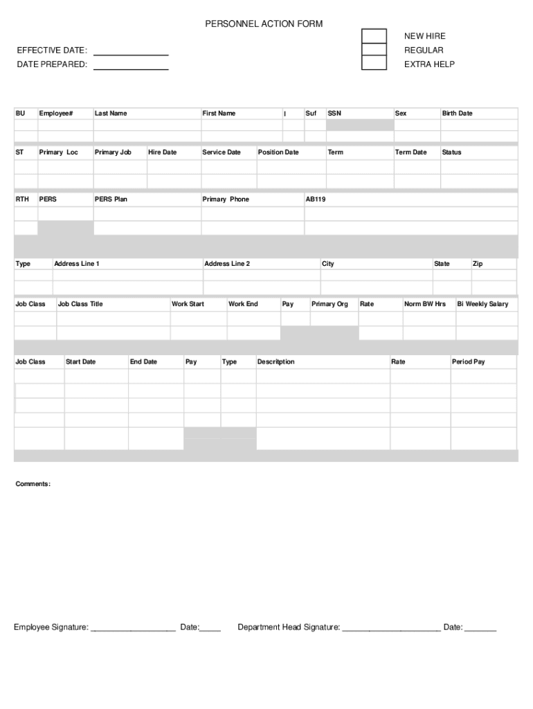 PERSONNEL ACTION FORM NEW HIRE EFFECTIVE DATE:REGULATE PREPARED:EXTRA HELPBUEmployee#Last NameSTPrimary Primary JobRTHPERSPERS PlanTypeFirst Hampshire Disservice Date Job Class Title Job ClassStart