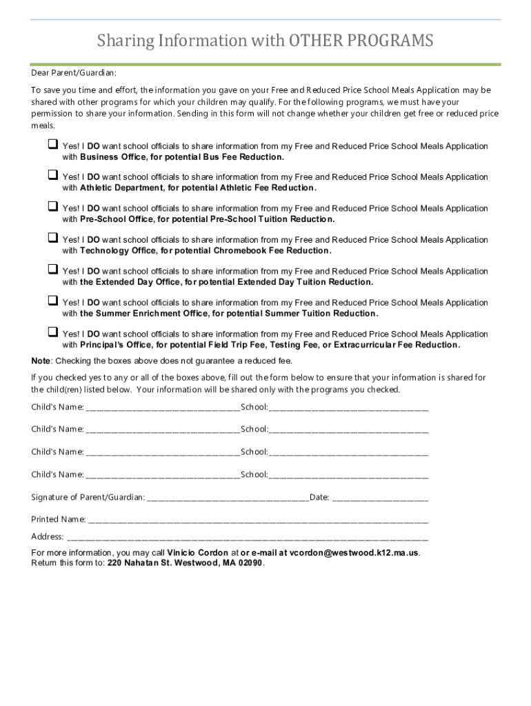 Sharing Information with OTHER Programmer Parent/Guardian:To save you time and effort, the information you gave on your Free and Reduced Price School Meals Application may be shared with other programs