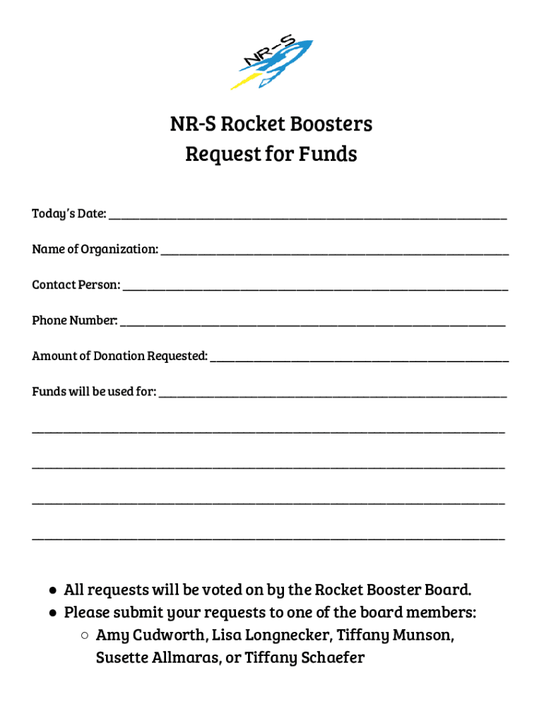 NRS Rocket Boosters Request for Funds Today's Date: Name of Organization: Contact Person: Phone Number: Amount of Donation Requested: Funds will be used for: All requests will be voted on by the Rocket