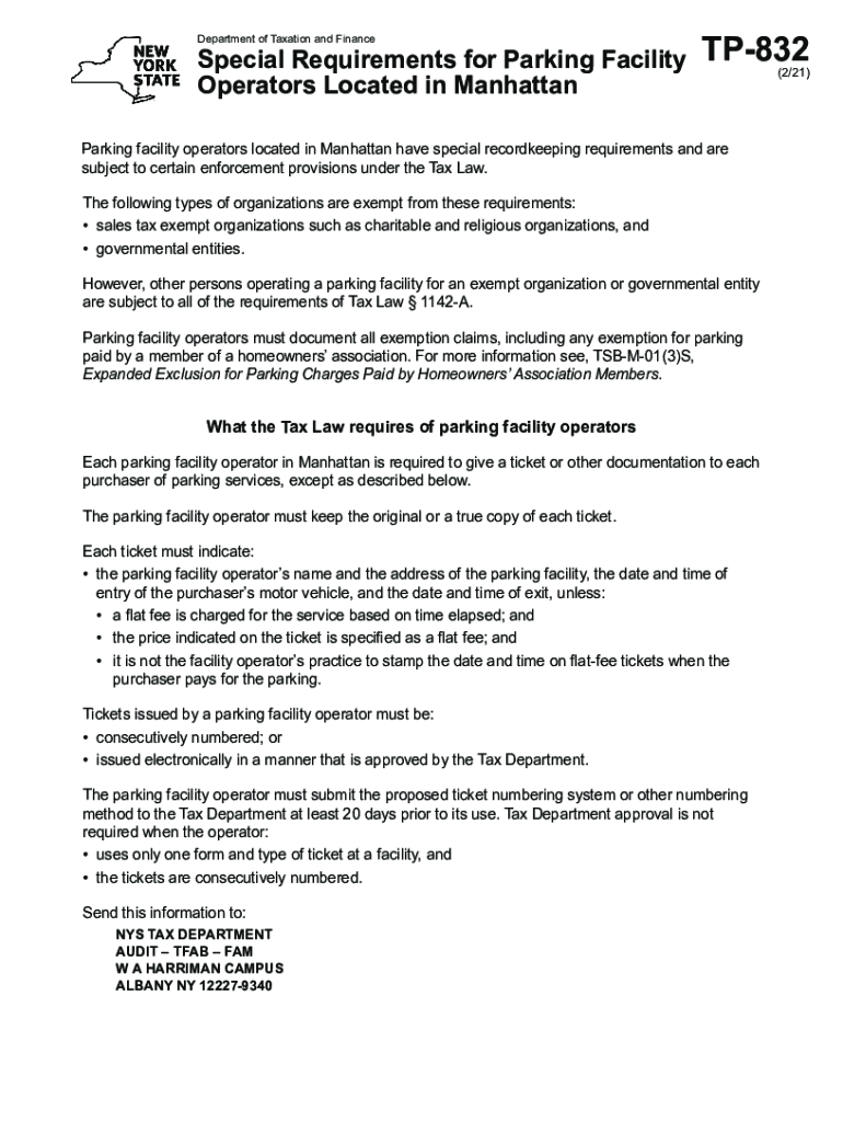 Department of Taxation and FinanceSpecial Requirements for Parking Facility Operators Located in ManhattanTP832Parking facility operators located in Manhattan have special record keeping requirements