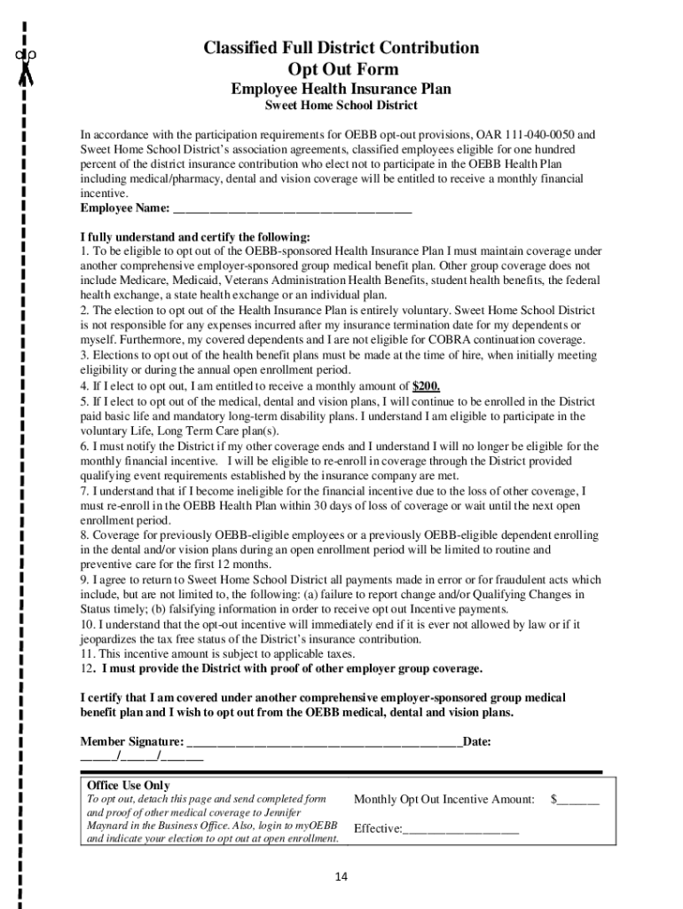 Classified Full District Contribution Opt-Out Form Employee Health Insurance Plan Sweet Home School District In accordance with the participation requirements for WEBB op tout provisions, OAR 1110400050