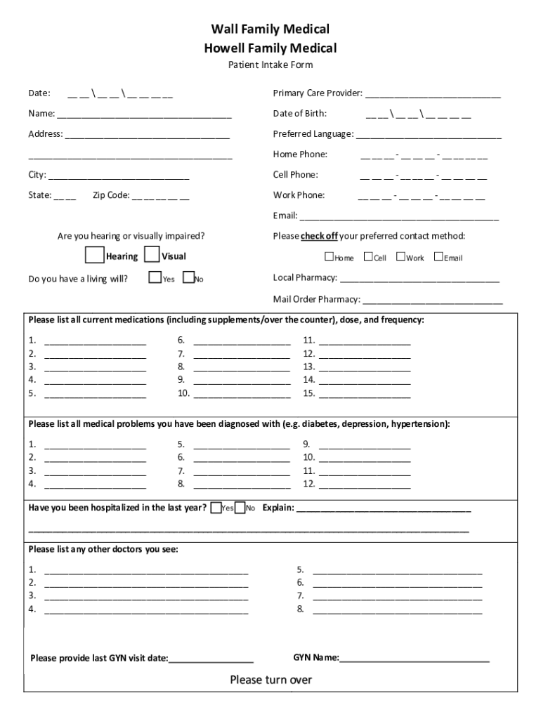 Wall Family Medical Howell Family Medical Patient Intake Format: Primary Care Provider: Name: Date of Birth:Address: Preferred Language: Home Phone: City: Cell Phone: State: Work Phone: Zip Code: