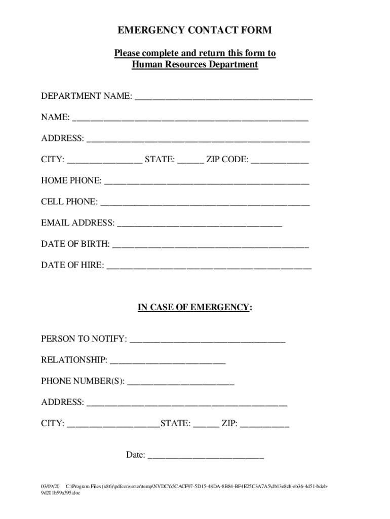 EMERGENCY CONTACT FORM Please complete and return this form to Human Resources Department NAME: NAME: ADDRESS: CITY: STATE: ZIP CODE: HOME PHONE: CELL PHONE: EMAIL ADDRESS: DATE OF BIRTH: DATE OF