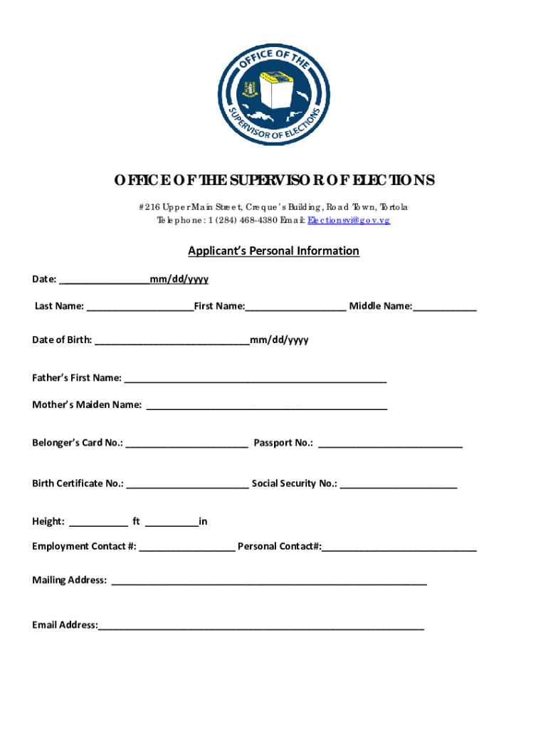 OFFICE OF THE SUPERVISOR OF ELECTIONS #216 Upper Main Street, Request Building, Road Town, Tortola Telephone: 1 (284) 4684380 Email: Elections vi gov. Applicants Personal Information Date: mm/dd/YYY