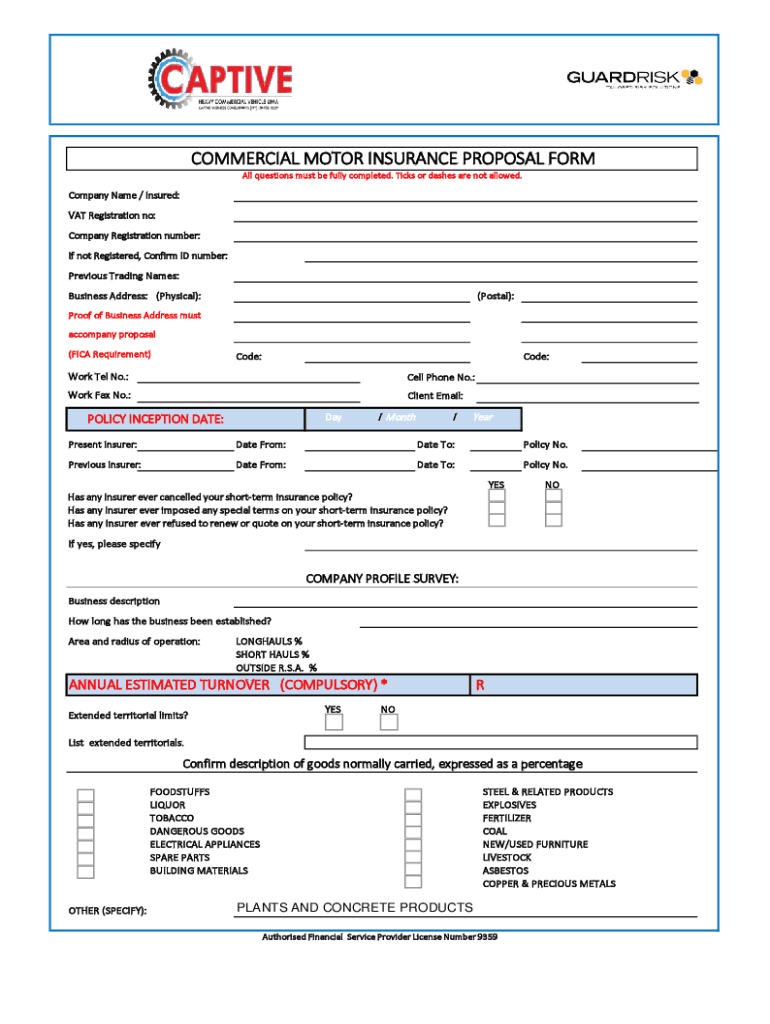 COMMERCIAL MOTOR INSURANCE PROPOSAL FORM All questions must be fully completed. Ticks or dashes are not allowed. Company Name / Insured: VAT Registration no: Company Registration number: If not Registered,