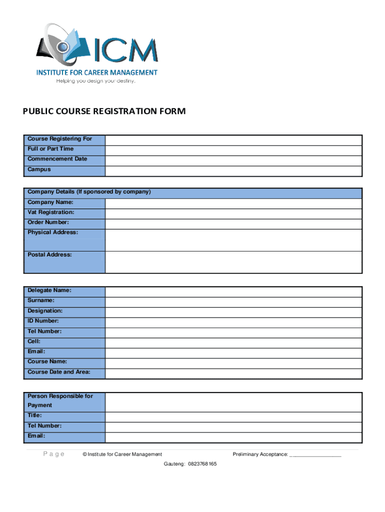 PUBLIC COURSE REGISTRATION FORM Course Registering For Full or Part Time Commencement Date CampusCompany Details (If sponsored by company) Company Name: Vat Registration: Order Number: Physical Address:Postal