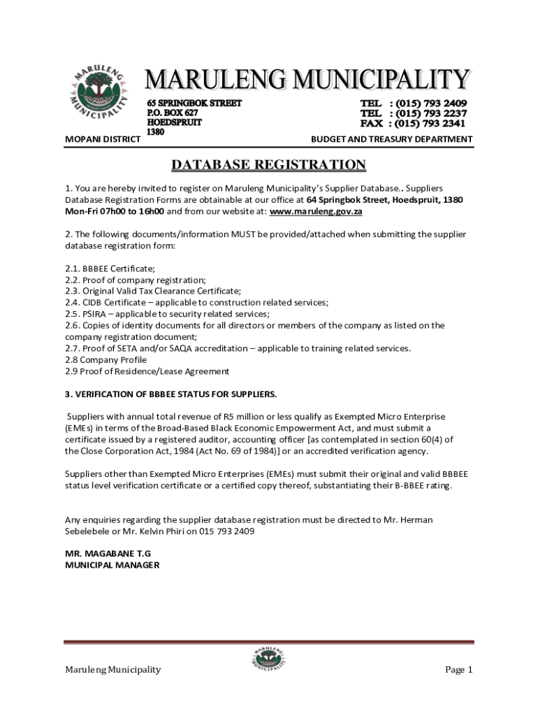 MOP ANI DISTRICTBUDGET AND TREASURY DEPARTMENTDATABASE REGISTRATION 1. You are hereby invited to register on Marlene Municipalities Supplier Database. Suppliers Database Registration Forms are obtainable