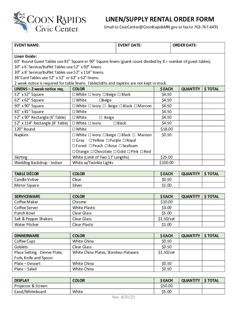 LINEN/SUPPLY RENTAL ORDER FORM Email to CivicCenter CoonRapidsMN.gov or fax to 7637676491EVENT NAME:EVENT DATE:ORDER DATE:Linen Guide: 60 Round Guest Tables use 81 Square or 90 Square linens (guest