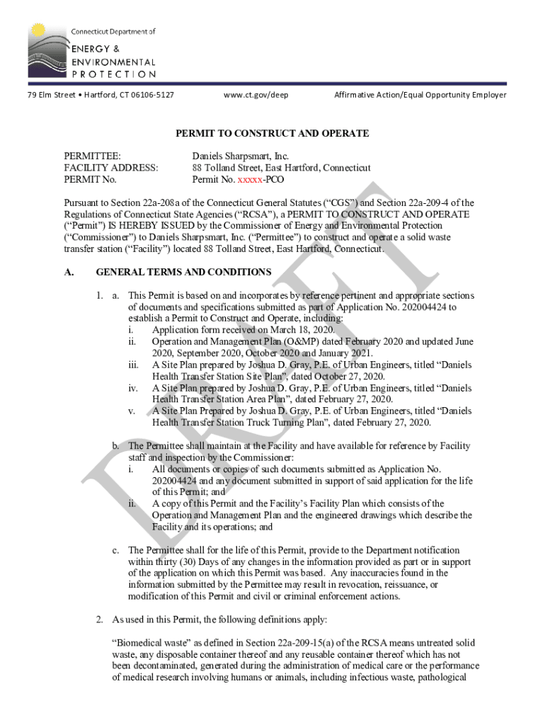 79 Elm Street Hartford, CT 061065127www.ct.gov/deepAffirmative Action/Equal Opportunity EmployerPERMIT TO CONSTRUCT AND OPERATE PERMITTED: FACILITY ADDRESS: PERMIT No. Daniels Sharp smart, Inc. 88