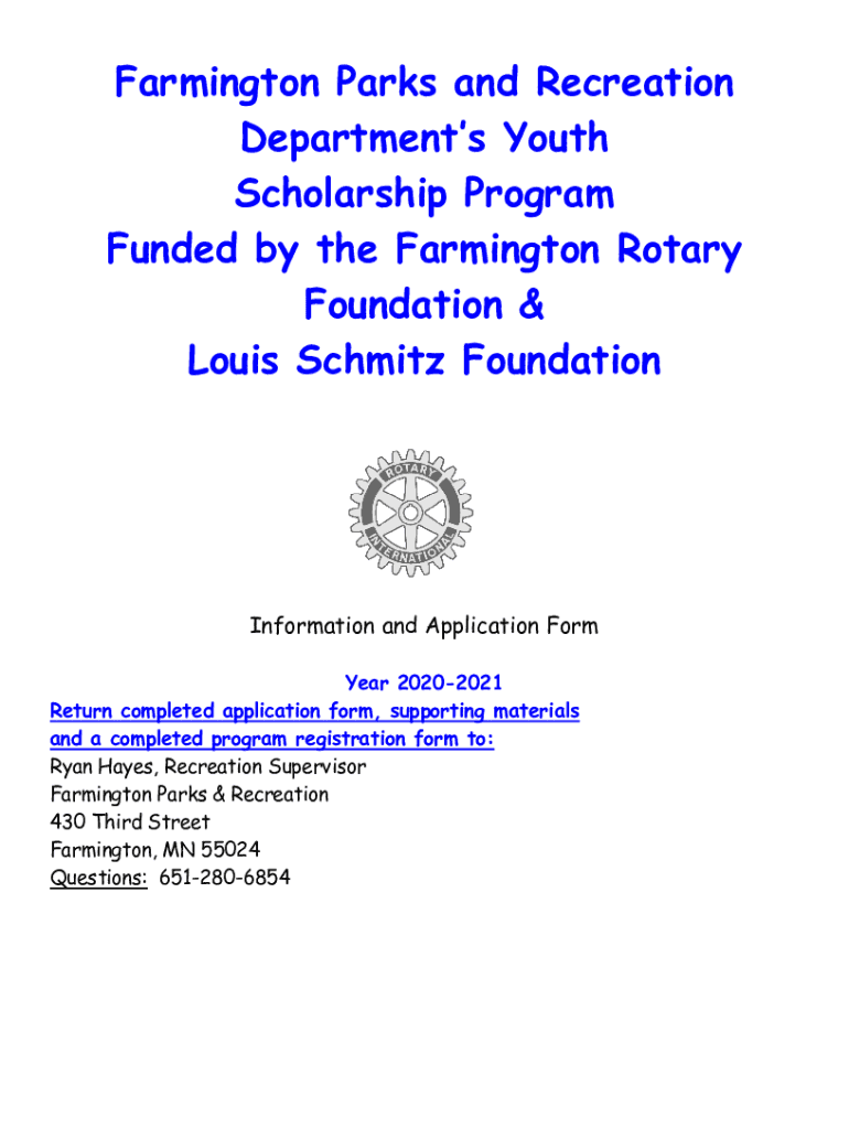 Farmington Parks and Recreation Departments Youth Scholarship Program Funded by the Farmington Rotary Foundation & Louis Schmitz FoundationInformation and Application Form Year 20202021 Return completed
