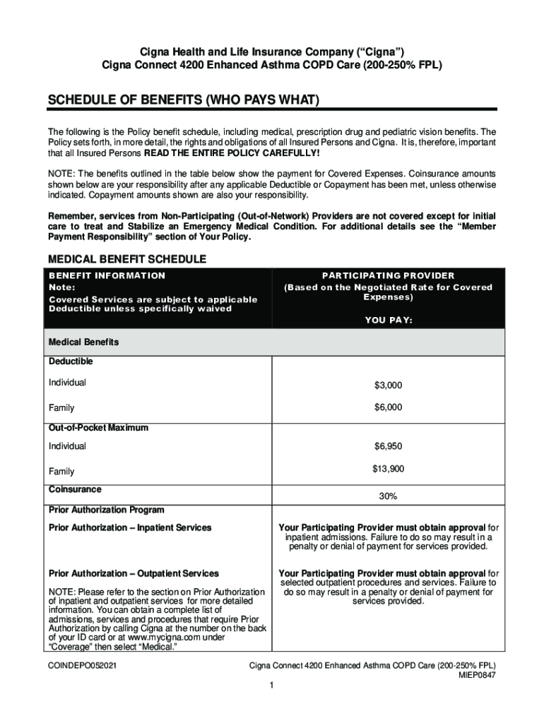 Cagney Health and Life Insurance Company (Cagney) Cagney Connect 4200 Enhanced Asthma COPD Care (200250% GPL)SCHEDULE OF BENEFITS (WHO PAYS WHAT) The following is the Policy benefit schedule, including