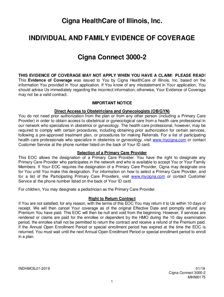 Cagney Healthcare of Illinois, Inc. INDIVIDUAL AND FAMILY EVIDENCE OF COVERAGE Cagney Connect 30002 THIS EVIDENCE OF COVERAGE MAY NOT APPLY WHEN YOU HAVE A CLAIM! PLEASE READ! This Evidence of Coverage