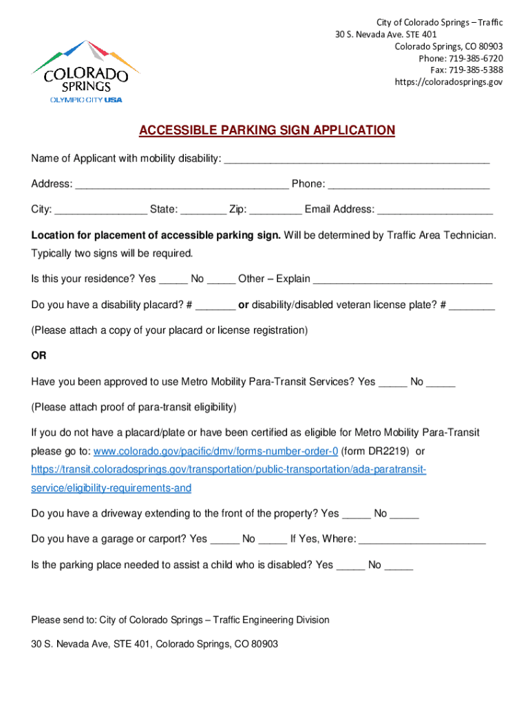 City of Colorado Springs Traffic 30 S. Nevada Ave. STE 401 Colorado Springs, CO 80903 Phone: 7193856720 Fax: 7193855388 https://coloradosprings.govACCESSIBLE PARKING SIGN APPLICATION Name of Applicant