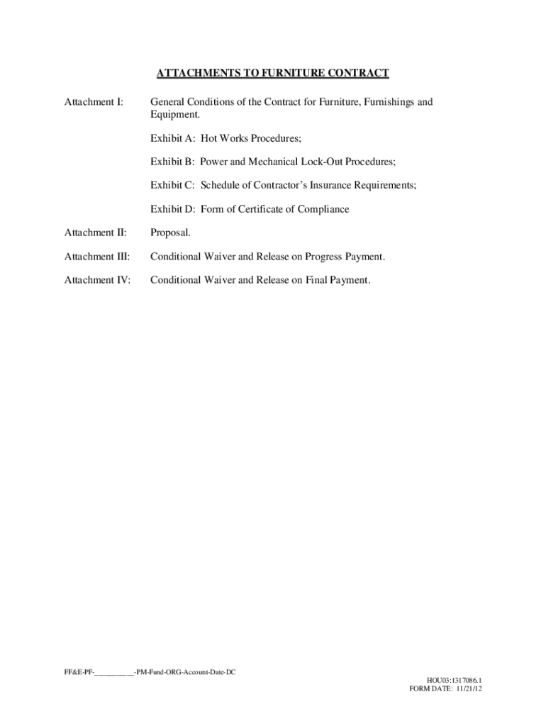 ATTACHMENTS TO FURNITURE CONTRACT Attachment I:General Conditions of the Contract for Furniture, Furnishings and Equipment. Exhibit A: Hot Works Procedures; Exhibit B: Power and Mechanical Lockout