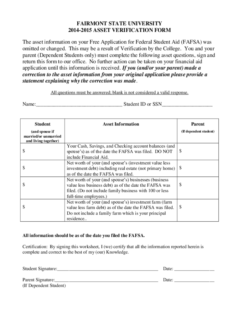 FAIRMONT STATE UNIVERSITY 20142015 ASSET VERIFICATION FORM The asset information on your Free Application for Federal Student Aid (FAFSA) was omitted or changed. This may be a result of Verification