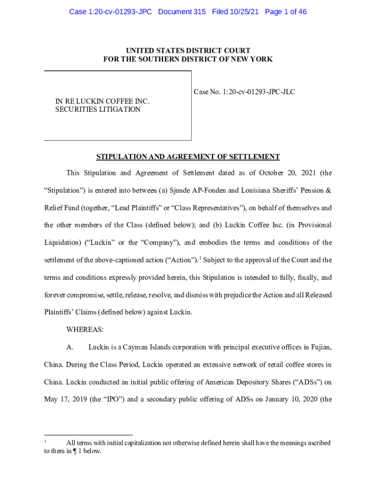 Case 1:20cv01293JPC Document 315 Filed 10/25/21-Page 1 of 46UNITED STATES DISTRICT COURT FOR THE SOUTHERN DISTRICT OF NEW Bookcase No. 1:20cv01293JPCJLC IN RE LUCKING COFFEE INC. SECURITIES LITIGATIONSTIPULATION