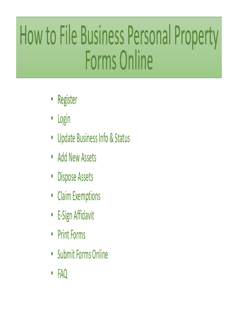 How to File Business Personal Property Forms Online Register Login Update Business Info & Status Add New Assets Dispose Assets Claim Exemptions Design Affidavit Print Forms Submit Forms Online FAQRegisterThis