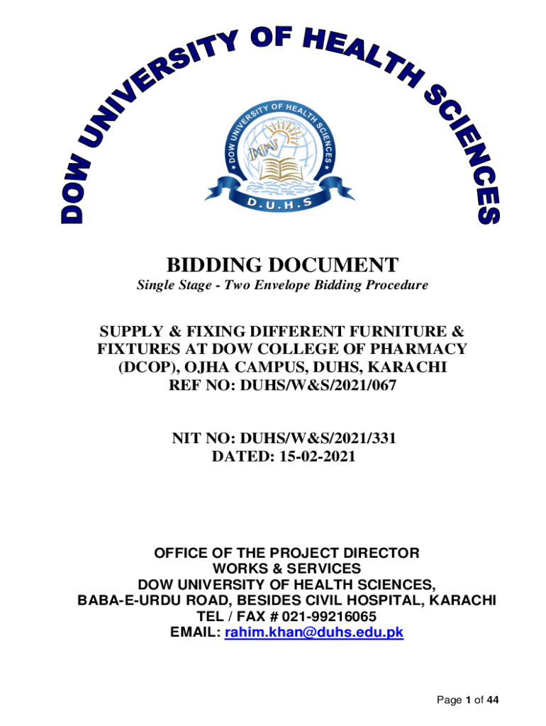 BIDDING DOCUMENT Single Stage Two Envelope Bidding ProcedureSUPPLY & FIXING DIFFERENT FURNITURE & FIXTURES AT DOW COLLEGE OF PHARMACY (DROP), OSHA CAMPUS, DUES, KARACHI Refs NO: DUES/W&S/2021/067NIT
