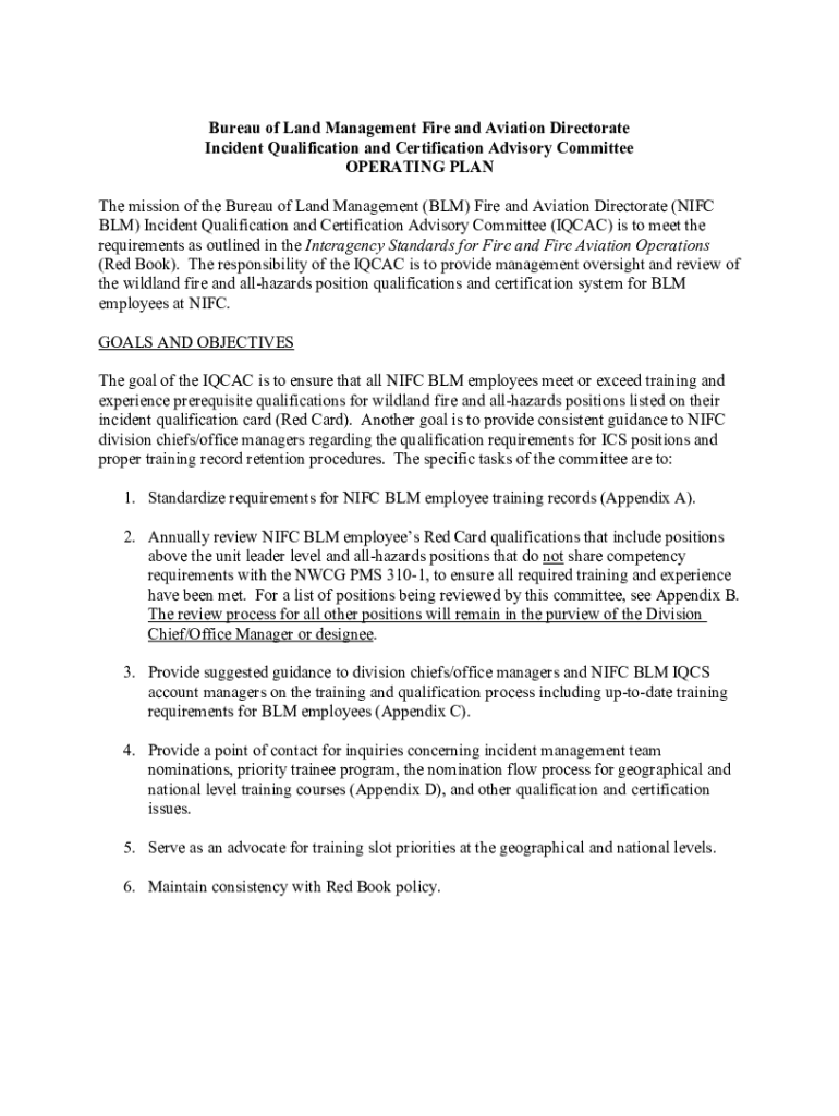 Bureau of Land Management Fire and Aviation Directorate Incident Qualification and Certification Advisory Committee OPERATING PLAN The mission of the Bureau of Land Management (BLM) Fire and Aviation
