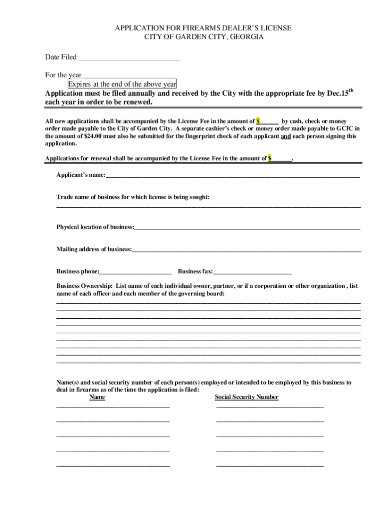 APPLICATION FOR FIREARMS DEALERS LICENSE CITY OF GARDEN CITY, GEORGIA Date Filed For the year Expires at the end of the above year Application must be filed annually and received by the City with