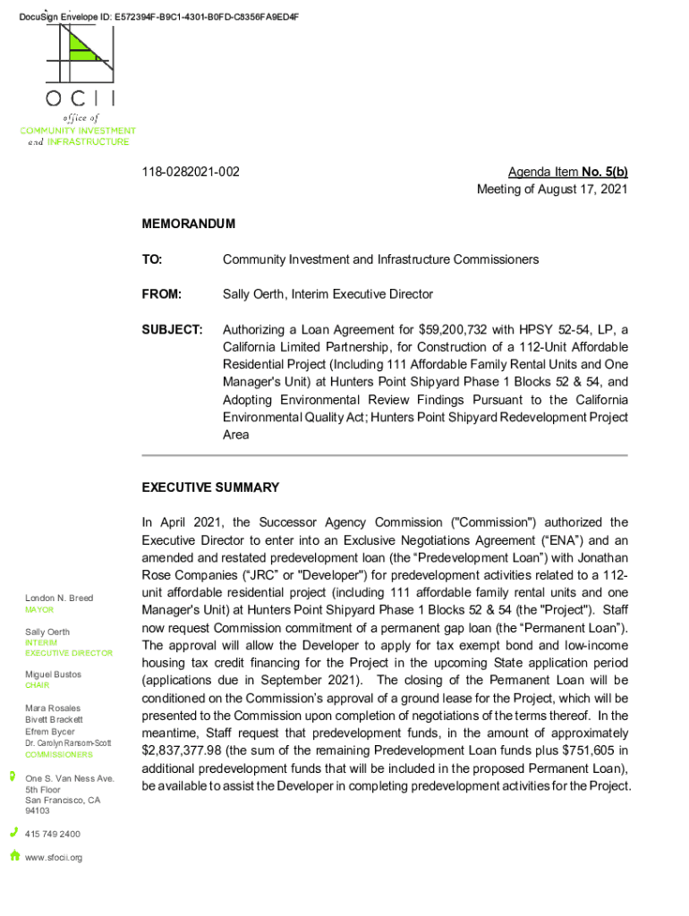 1180282021002Agenda Item No. 5(b) Meeting of August 17, 2021MEMORANDUM TO:Community Investment and Infrastructure CommissionersFROM:Sally Perth, Interim Executive DirectorSUBJECT:Authorizing a Loan