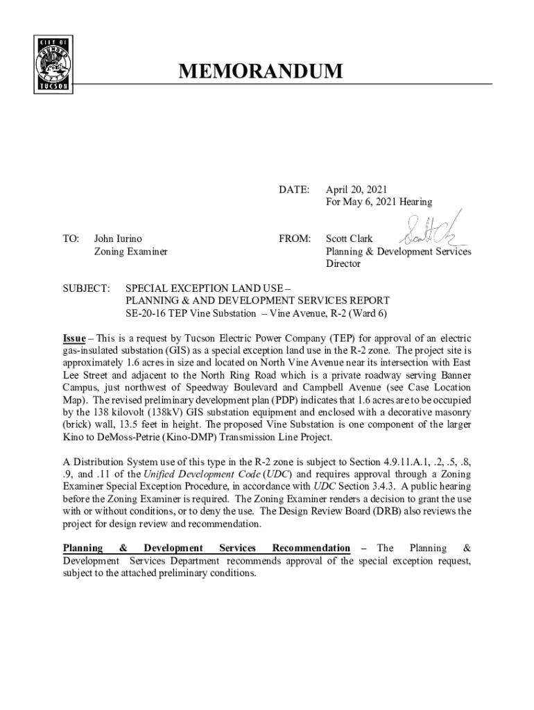 MEMORANDUM TO:John During Zoning ExaminerSUBJECT:DATE:April 20, 2021, For May 6, 2021, HearingFROM:Scott Clark Planning & Development Services DirectorSPECIAL EXCEPTION LAND USE PLANNING & AND DEVELOPMENT