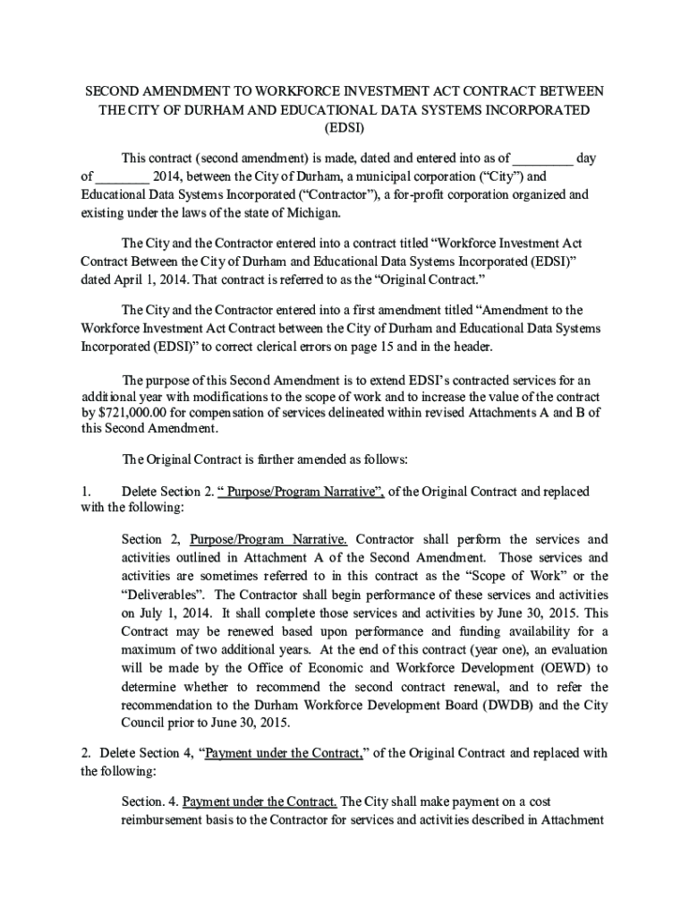 SECOND AMENDMENT TO WORKFORCE INVESTMENT ACT CONTRACT BETWEEN THE CITY OF DURHAM AND EDUCATIONAL DATA SYSTEMS INCORPORATED (EDS) This contract (Second Amendment) is made, dated and entered into as