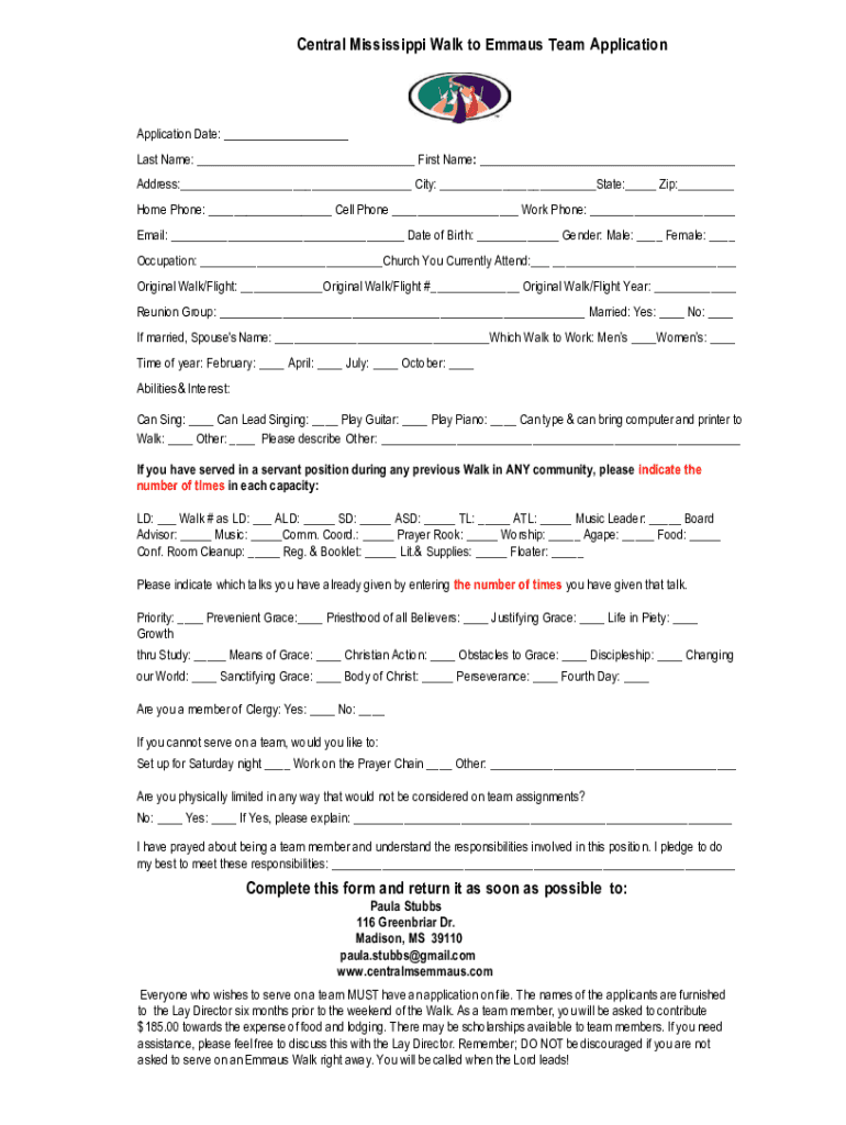 Central Mississippi Walk to Emma us Team ApplicationApplication Date: Last Name: First Name: Address: City: State: Zip: Home Phone: Cell Phone Work Phone: Email: Date of Birth: Gender: Male: Female: