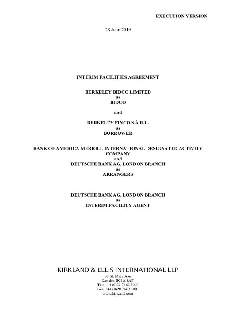 EXECUTION VERSION 28 June 2019INTERIM FACILITIES AGREEMENT BERKELEY BI DCO LIMITED as BI DCO and BERKELEY FINCH S. R.L. as BORROWER BANK OF AMERICA MERRILL INTERNATIONAL DESIGNATED ACTIVITY COMPANY