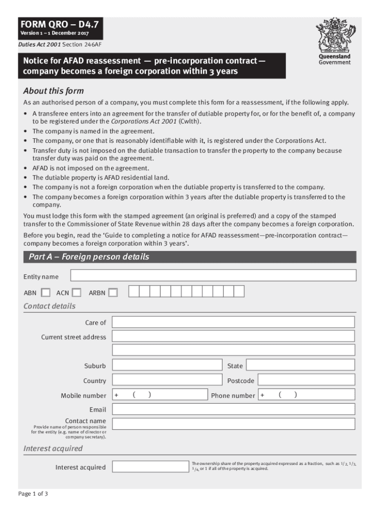 FORM PRO D4.7 Version 1 1 December 2017Duties Act 2001 Section 246AFGuide to completing a notice for AFAR reassessment preincorporation contract company becomes a foreign corporation within 3 years