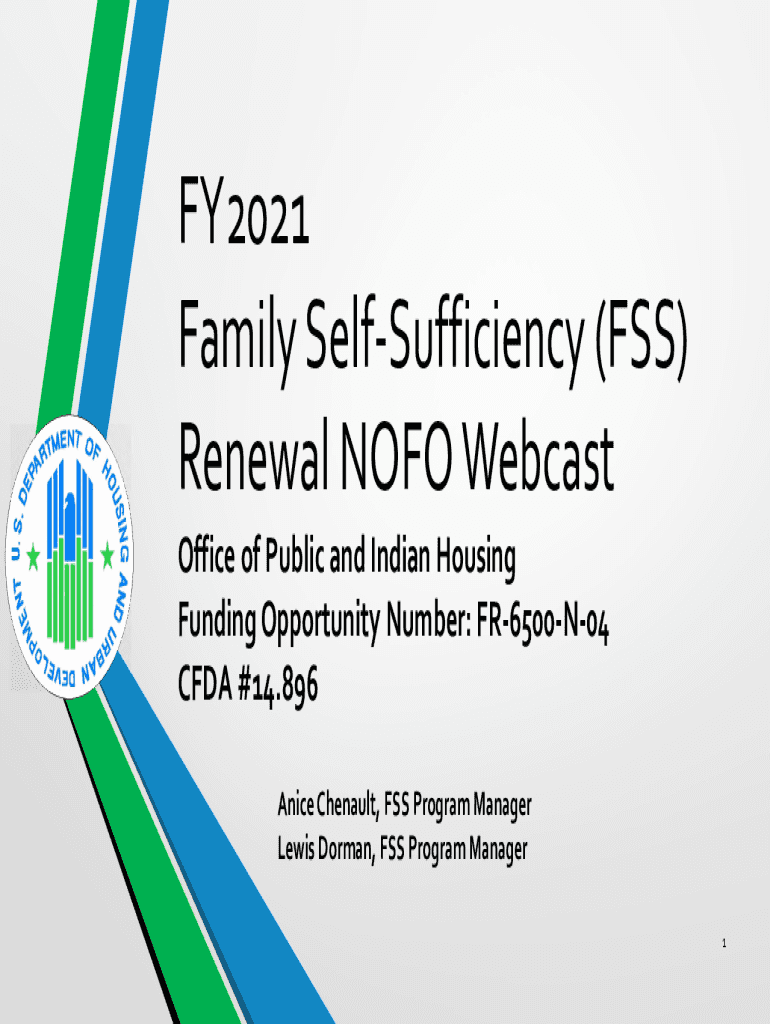 FY2021 Family Self-sufficiency (FSS) Renewal NO FO Webcast Office of Public and Indian Housing Funding Opportunity Number: FR6500N04 CODA #14.896 Nice Renault, FSS Program Manager Lewis Norman, FSS