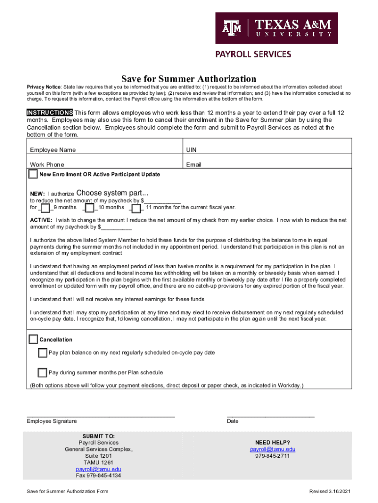 Save for Summer AuthorizationPrivacy Notice: State law requires that you be informed that you are entitled to: (1) request to be informed about the information collected about yourself on this form