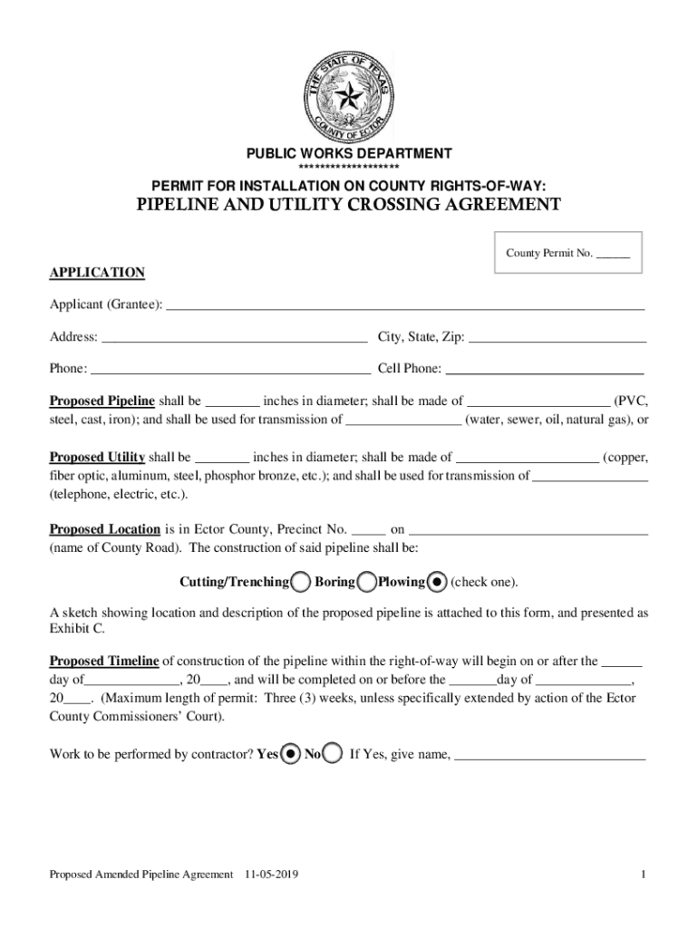 PUBLIC WORKS DEPARTMENT ******************* PERMIT FOR INSTALLATION ON COUNTY RIGHTSOFWAY:PIPELINE AND UTILITY CROSSING AGREEMENT County Permit No. APPLICATION Applicant (Grantee): Address: City,