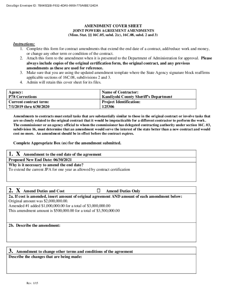 DocuSign Envelope ID: 7B645D2BF6324DA59959775A6BE124DAAMENDMENT COVER SHEET JOINT POWERS AGREEMENT AMENDMENTS (Minn. Stat. 16C.05, sub. 2(c), 16C.08, sub. 2 and 3)Instructions: 1. Complete this form