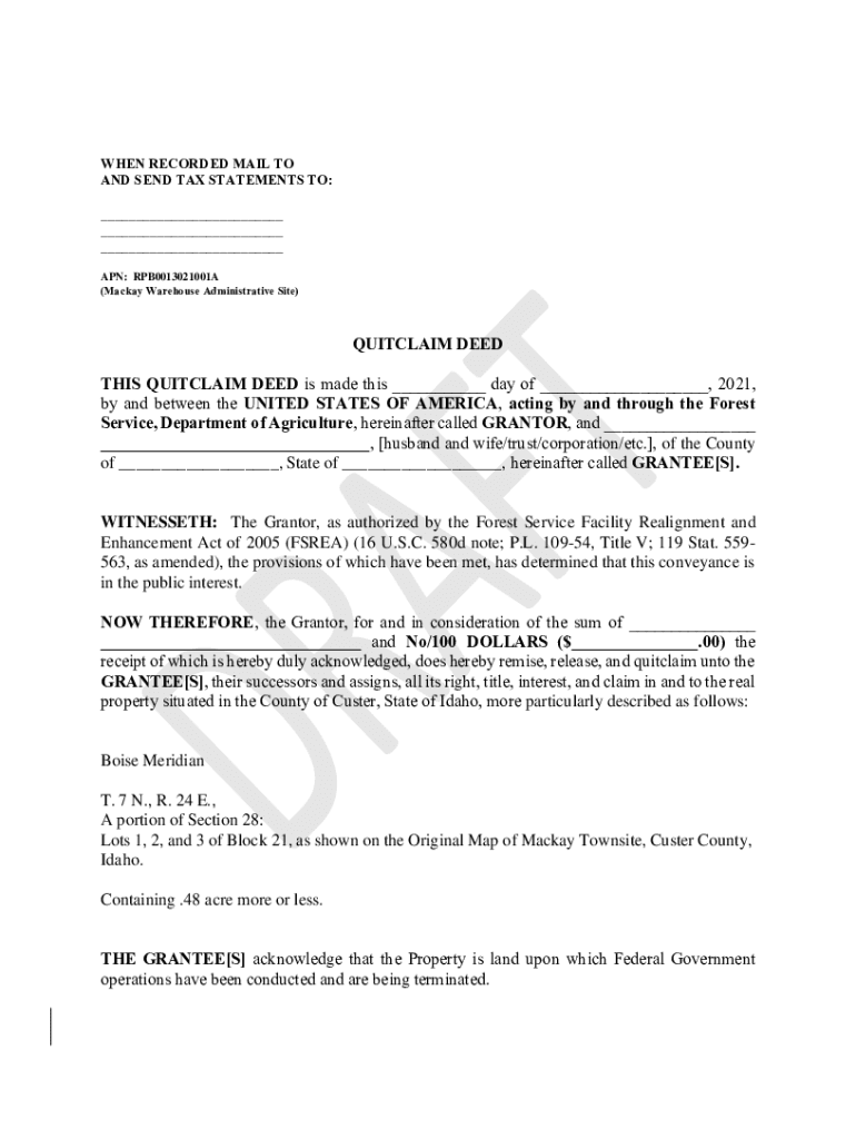 WHEN RECORDED MAIL TO AND SEND TAX STATEMENTS TO: APN: RPB0013021001A (Mackay Warehouse Administrative Site)QUITCLAIM DEED THIS QUITCLAIM DEED is made this day of, 2021, by and between the UNITED