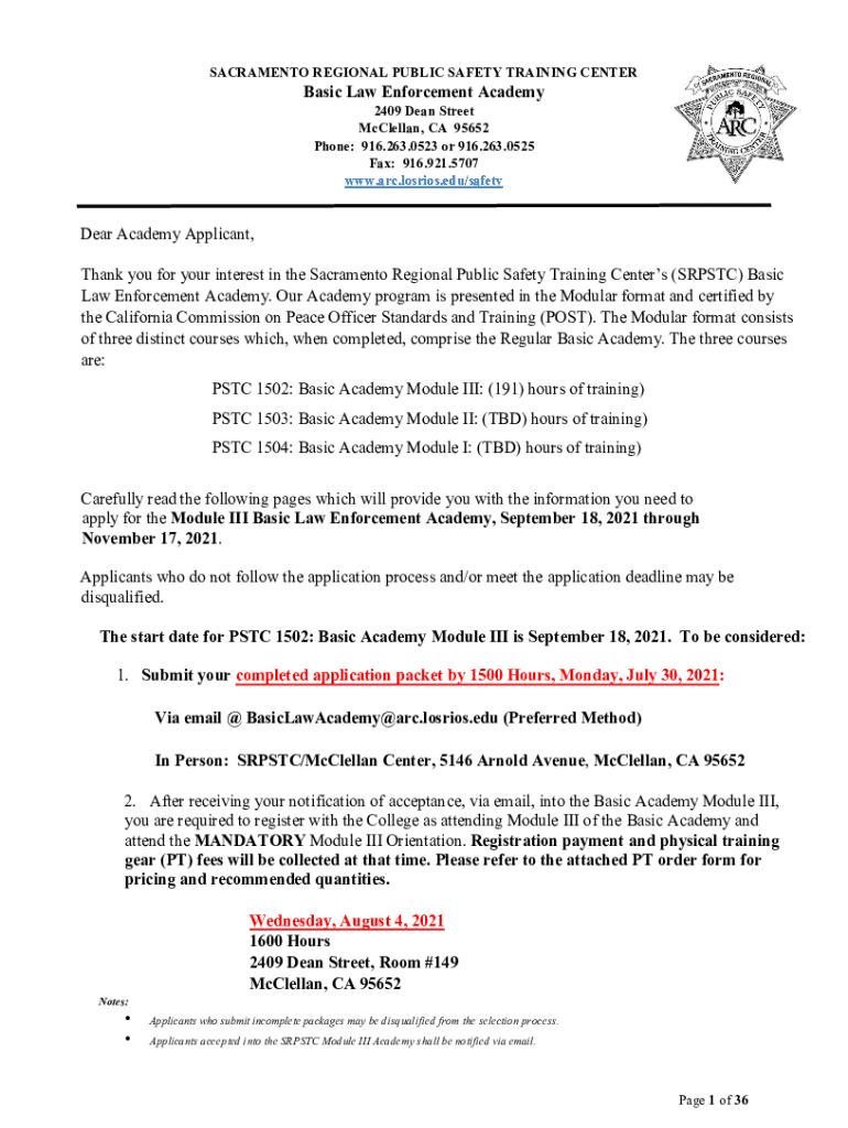 SACRAMENTO REGIONAL PUBLIC SAFETY TRAINING CENTERBasic Law Enforcement Academy 2409 Dean Street McClellan, CA 95652 Phone: 916.263.0523 or 916.263.0525 Fax: 916.921.5707 www.arc.losrios.edu/safetyDear