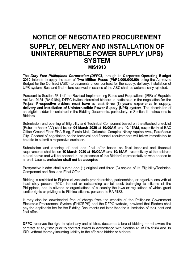 NOTICE OF NEGOTIATED PROCUREMENT SUPPLY, DELIVERY AND INSTALLATION OF UNINTERRUPTIBLE POWER SUPPLY (UPS) SYSTEM MIS1913 The Duty Free Philippines Corporation (DFP), through its Corporate Operating