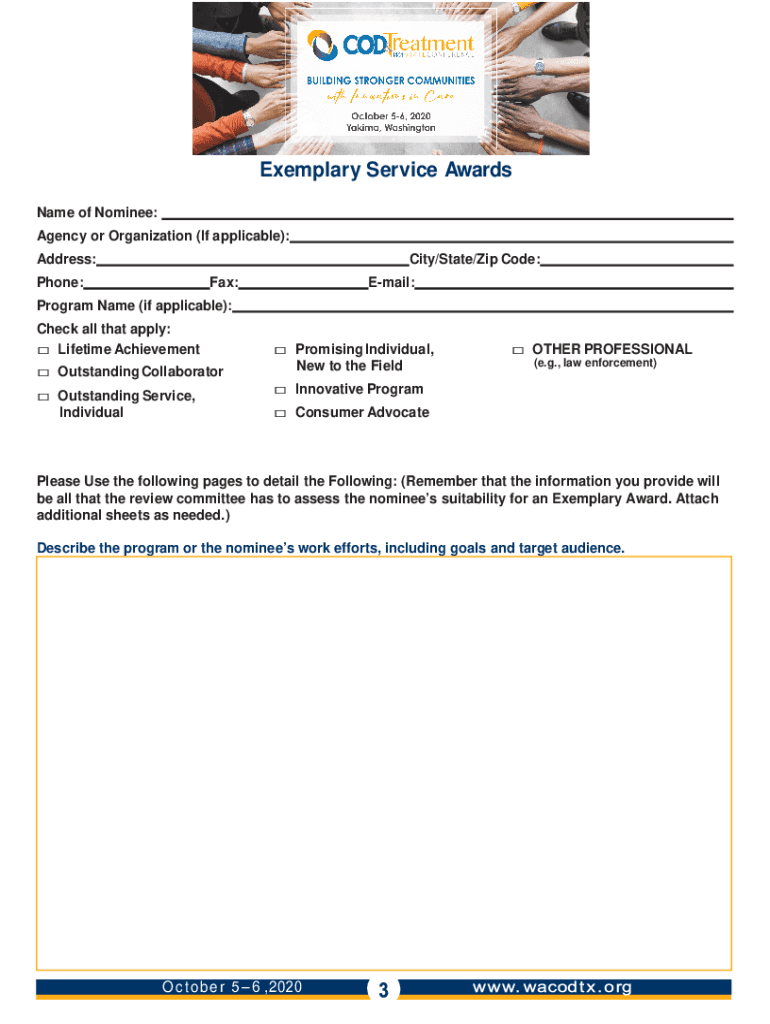 Exemplary Service Awards Thank you for your interest in nominating a professional or volunteer for the 2020 exemplary service awards. We know that you are busy, and tried to keep the application short,