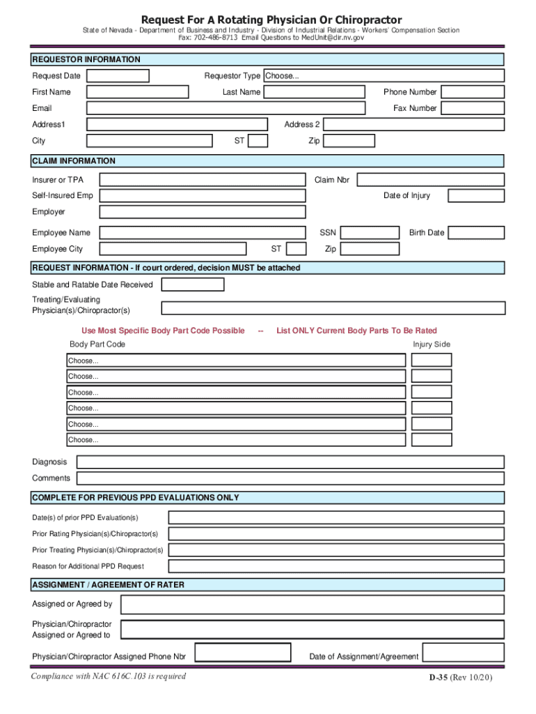 Request For A Rotating Physician Or ChiropractorState of Nevada Department of Business and Industry Division of Industrial Relations Workers Compensation Section Fax: 7024868713 Email Questions to