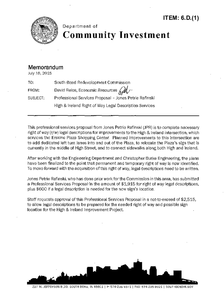 ITEM: 6. D.(1) Depart me NT community InvestmentMemorandum July 16, 2015TO:South Bend Redevelopment Commissioner:David Repos, EconomicSUBJECT:Professional Services Proposal Jones Metric RafinskiResourcesHigh