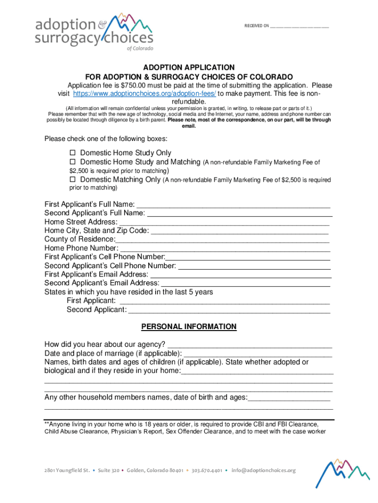 RECEIVED ON ADOPTION APPLICATION FOR ADOPTION & SURROGACY CHOICES OF COLORADO Application fee is $750.00 must be paid at the time of submitting the application. Please visit https://www.adoptionchoices.org/adoptionfees/