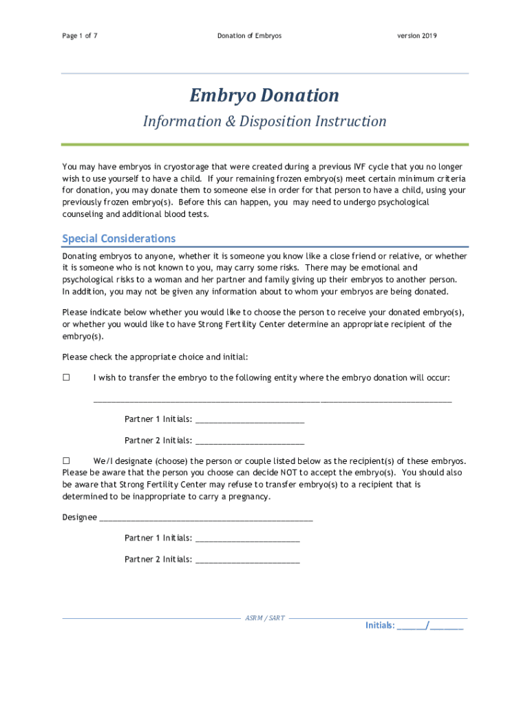 Page 1 of 7Donation of Embryos version 2019Embryo Donation Information & Disposition Instruction You may have embryos in cryostorage that were created during a previous IVF cycle that you no longer