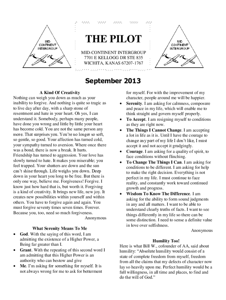 THE PILOT MID-CONTINENT INTERGROUP 7701 E KELLOGG DR STE 835 WICHITA, KANSAS 672071767September 2013 A Kind Of Creativity Nothing can weigh you down as much as your inability to forgive. And nothing