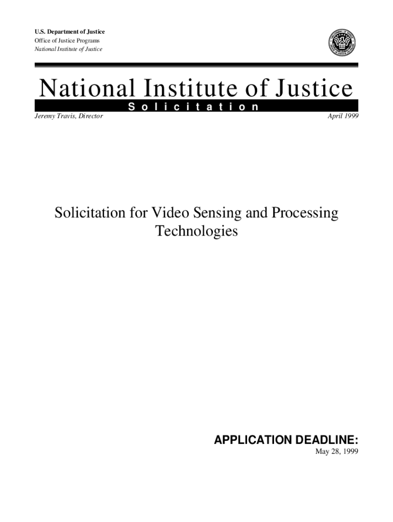 U.S. Department of Justice Office of Justice Programs National Institute of JusticeNational Institute of Justice S o l i c i t a t i o n Jeremy Travis, Director April 1999Solicitation for Video Sensing