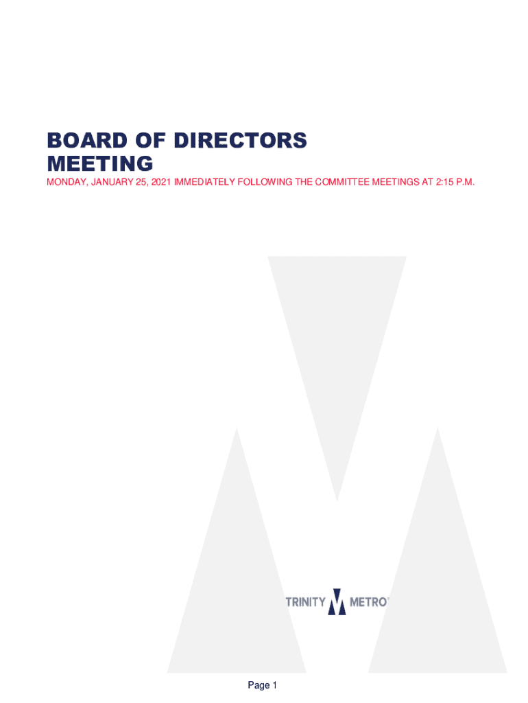 BOARD OF DIRECTORS MEETING MONDAY, JANUARY 25, 2021, IMMEDIATELY FOLLOWING THE COMMITTEE MEETINGS AT 2:15 P.M. Page 1BOARD OF DIRECTORS MEETING AGENDA (via VIRTUAL MEETING) MONDAY, JANUARY 25, 2021,