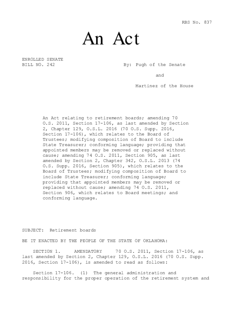 RBS No. 837An Act ENROLLED SENATE BILL NO. 242By: Pugh of the Senate and Martinez of the Housman Act relating to retirement boards; amending 70 O.S. 2011, Section 17106, as last amended by Section